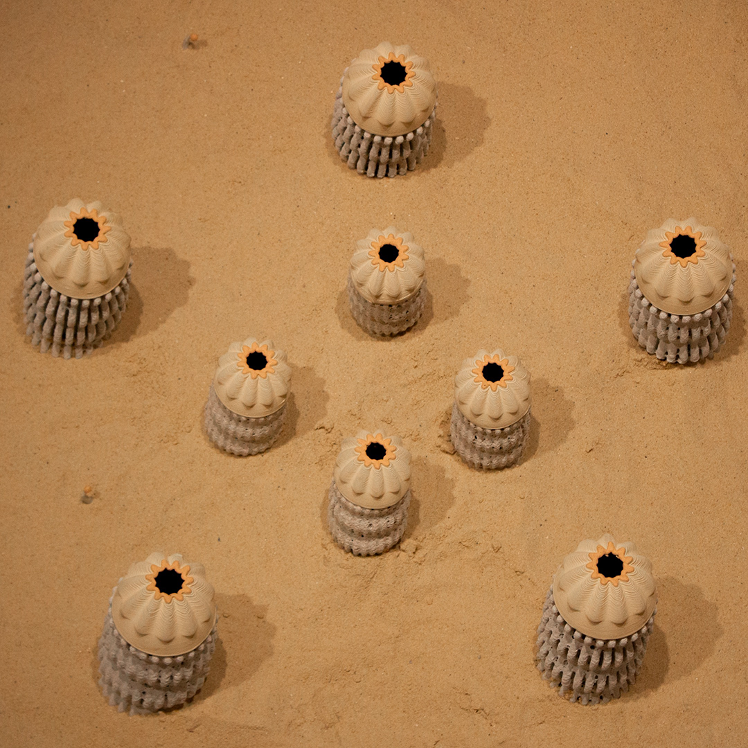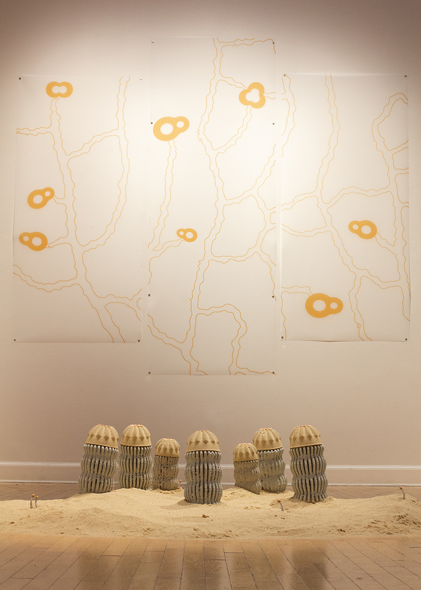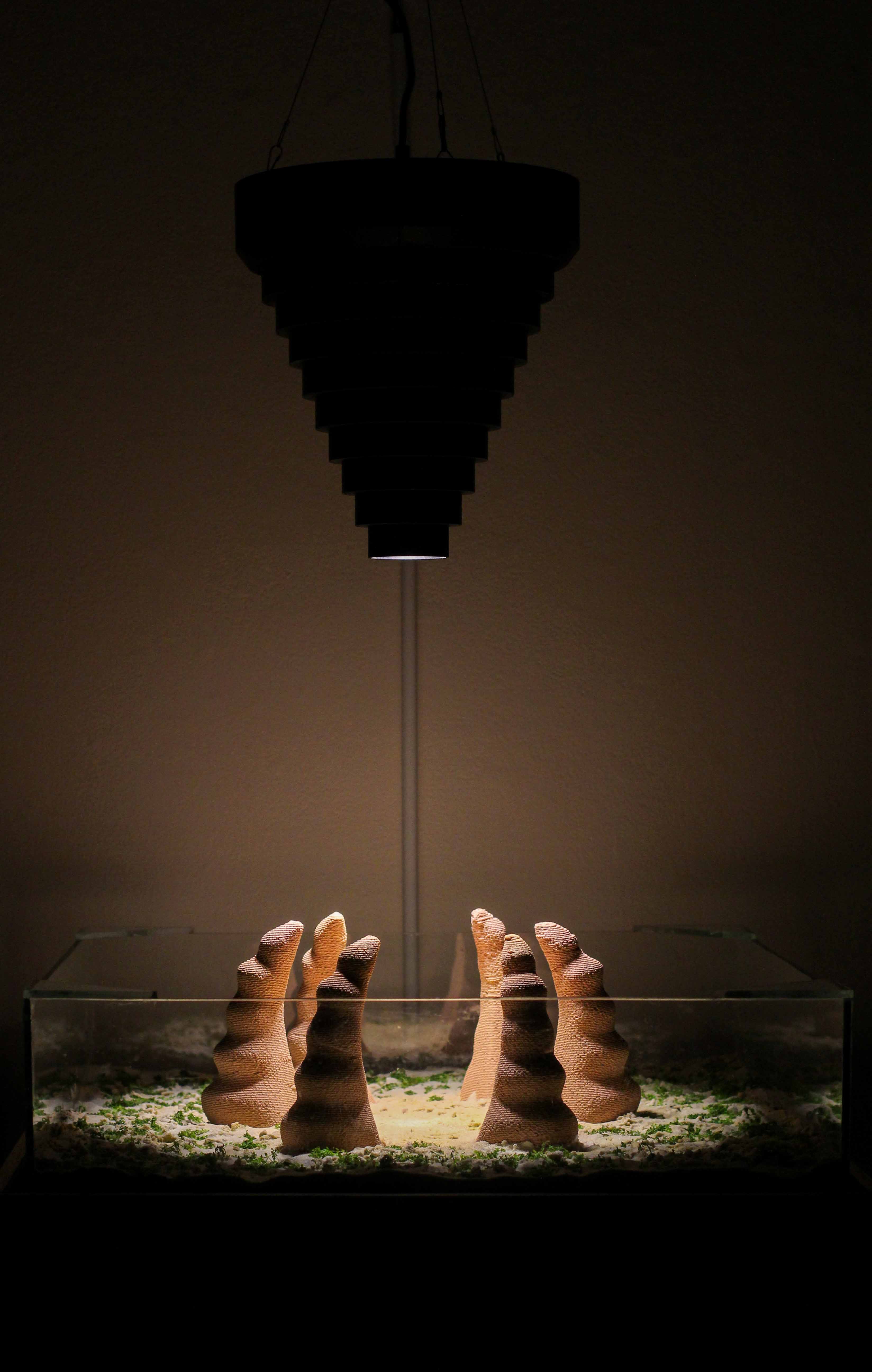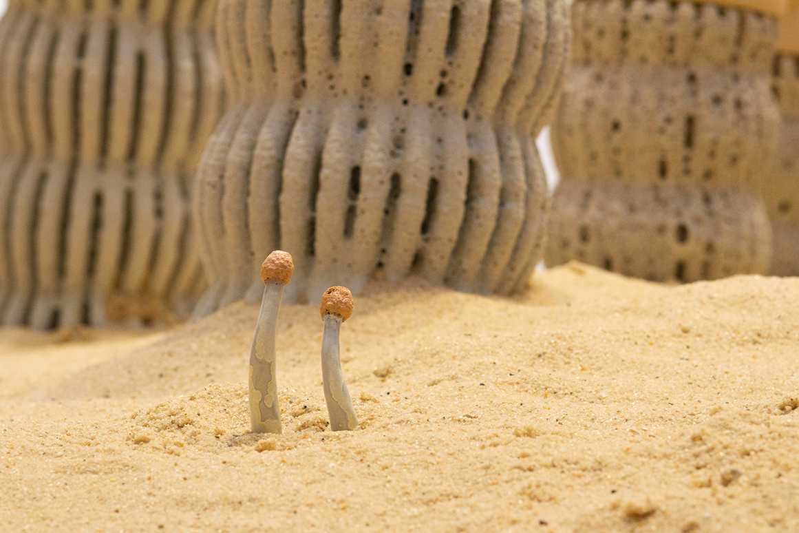 Using 3D modeling design software, such as Fusion 360 and Grasshopper, I employ a clay printer to create sculptural works that hybridize the forms of a smattering of biological structures, such as antennae, fins, webs, etc. I call upon the similarities in the morphologies of different species in the design of my models. The coral mush- room resembles a branching sea coral; a sea urchin mimics an Astrophytum asterias cactus.