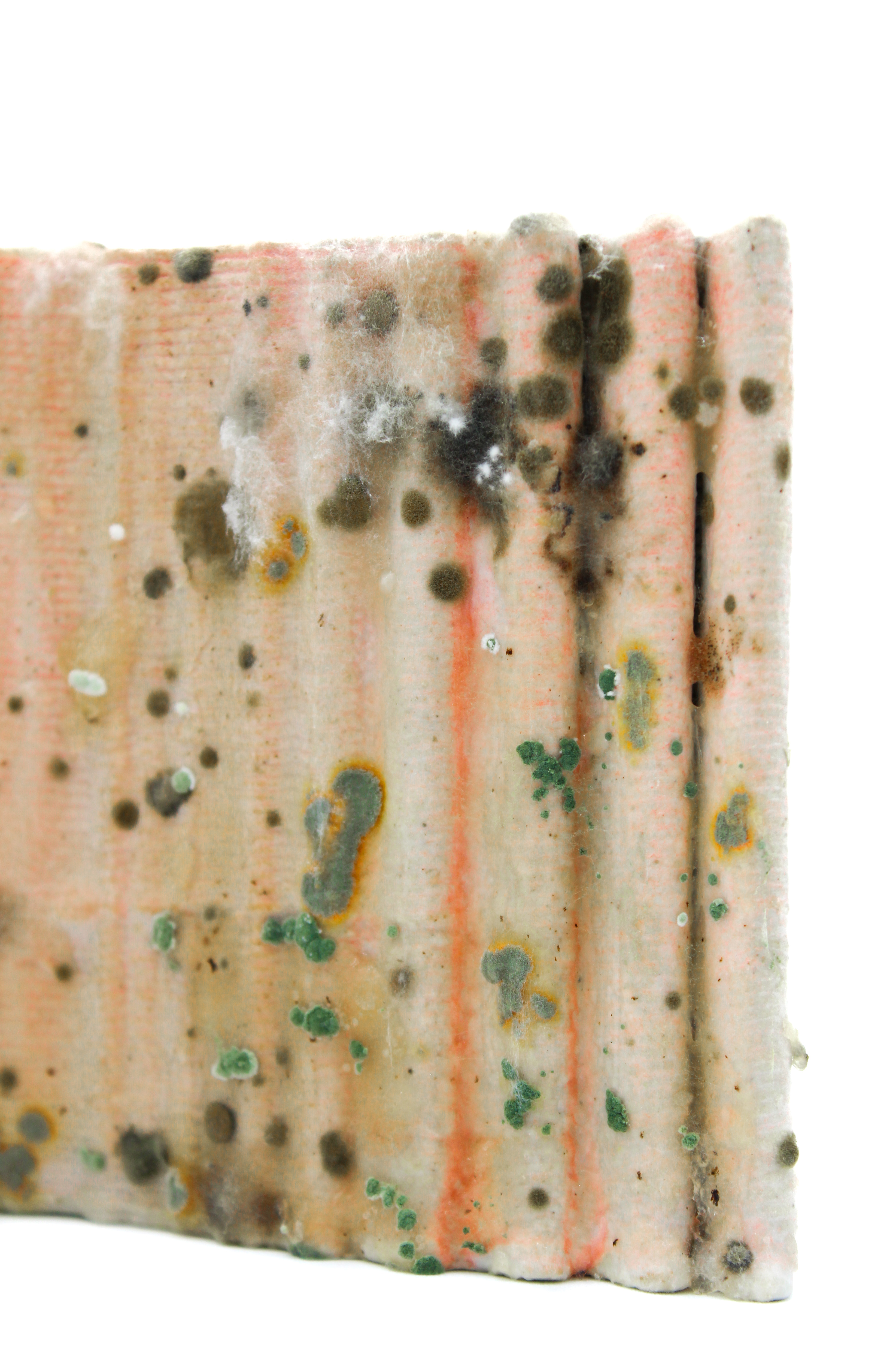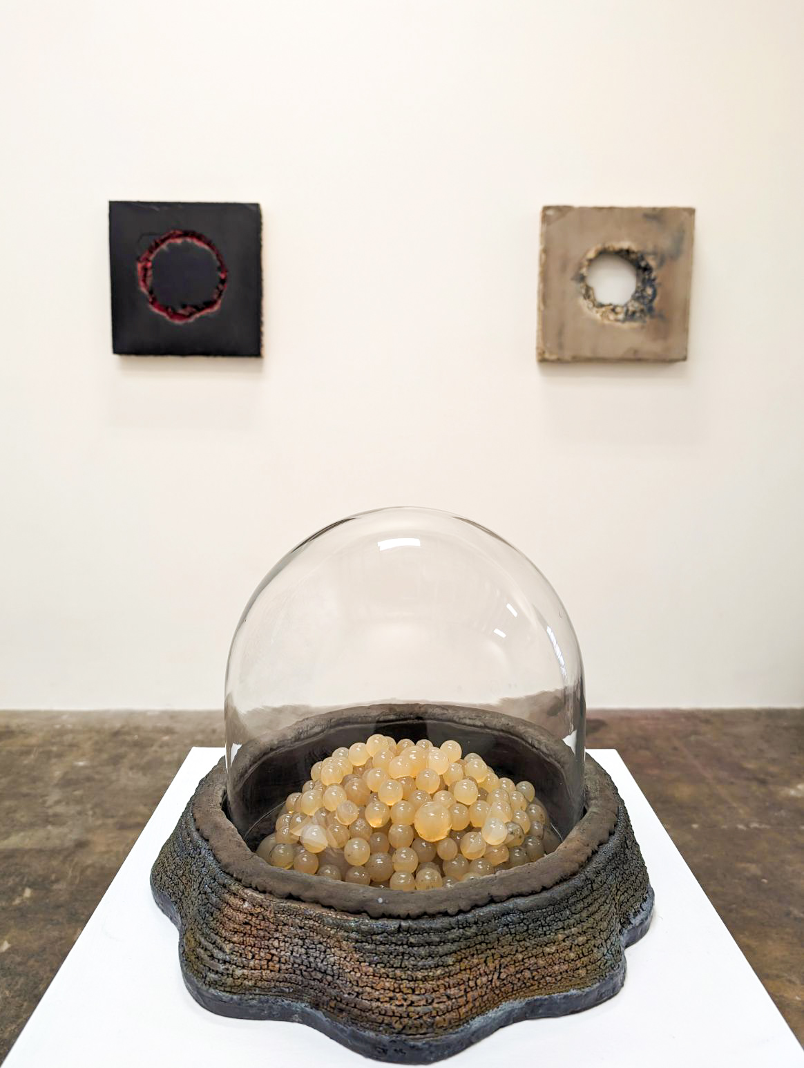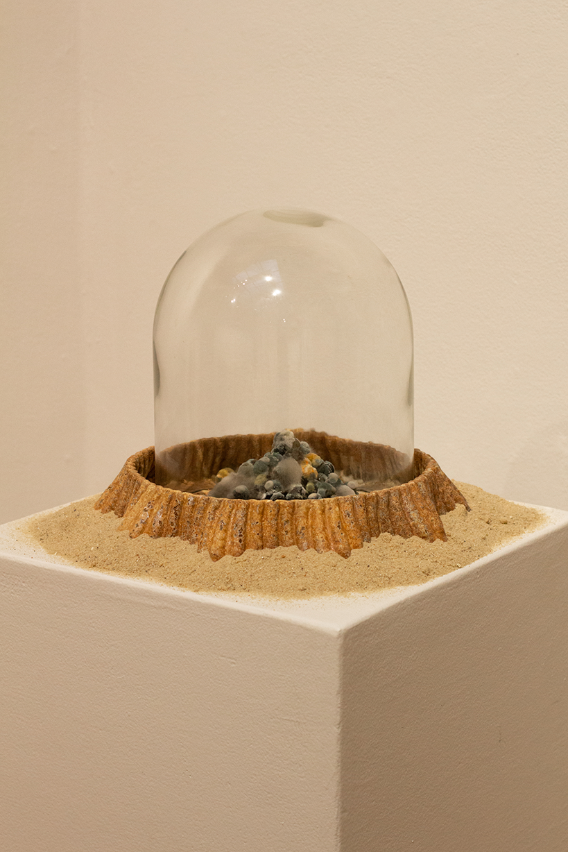 Upon the stacking of the agar ‘eggs’ I enclosed them in a pocket of air of the gallery air using the glass cloches. Previously undetectable by the human eye, the microbial life floating in the gallery air is rendered visible by the presence of the agar eggs. The colonies of mold sprawl across the uneaten agar, uniting them in a feast. As they claim territories, the egg stack depletes over time and becomes a blanket of varying textures and colors. By placing these communities of mold upon pedestals in a gallery setting (historically meant for objects of conventional beauty), I aimed to reframe them in a way that celebrates their intricate expressions; this gesture is in opposition to a human’s tendency to turn up their nose at the thought of mold.