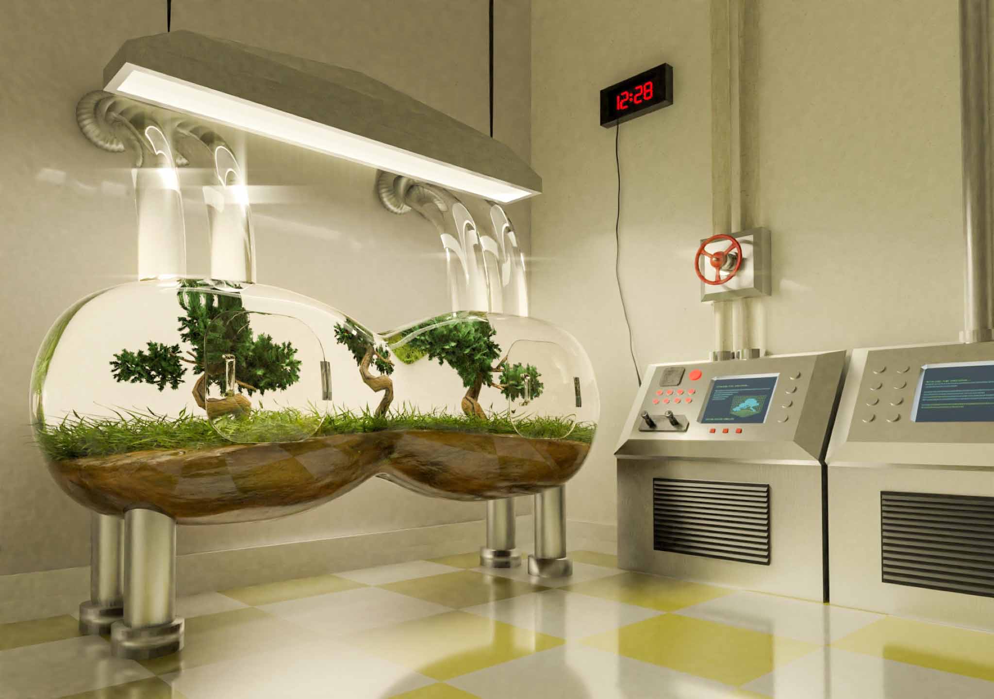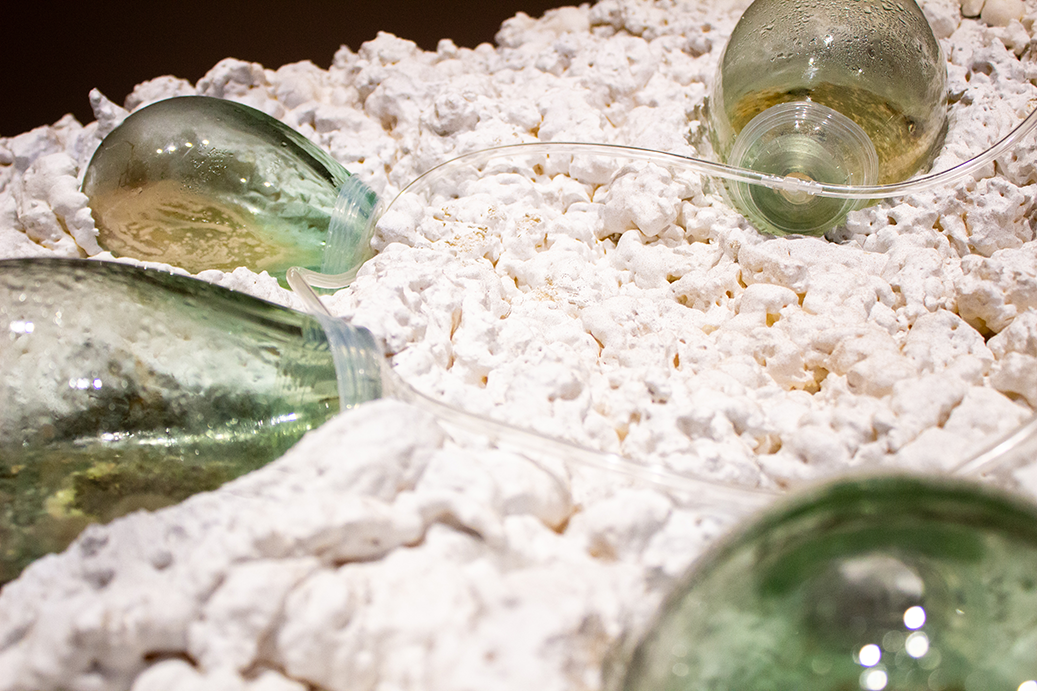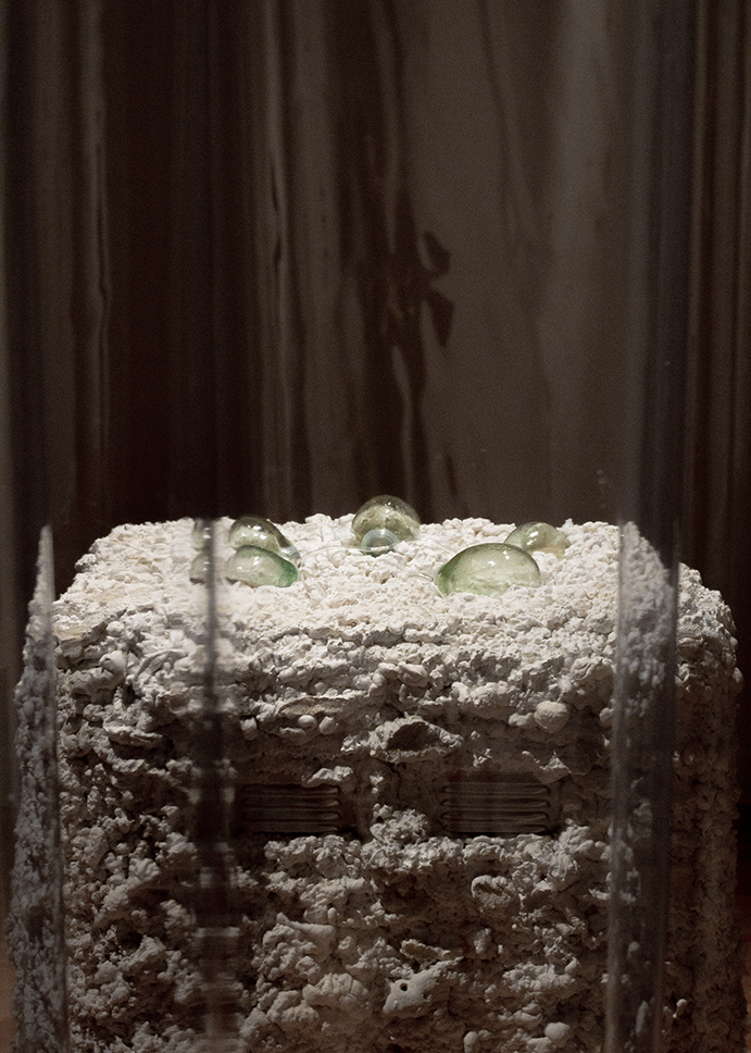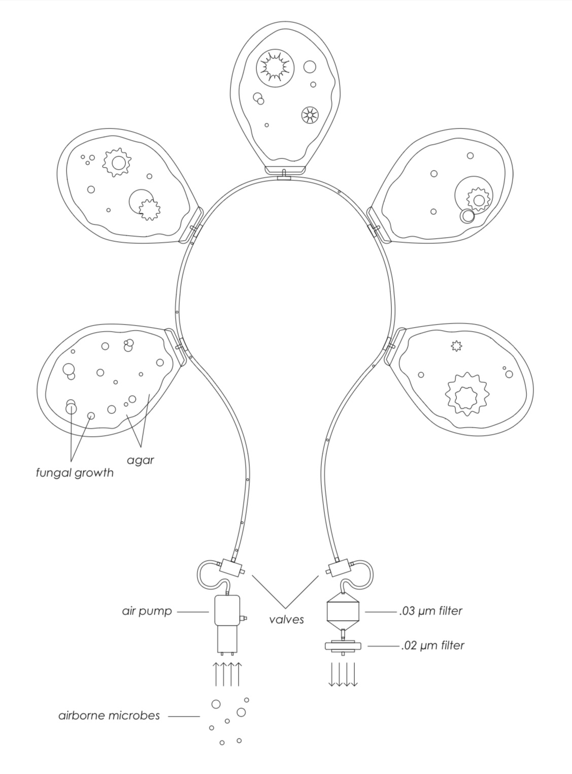 Pneuma features five closed ‘nests’, blown out of glass. A half cup of liquid agar was poured into each vessel. Quarter-inch tubing connects the nest, where air is periodically ingested through a metal vent, pushed through one nest and to the right by an air pump into another neighboring nest community, and back out through another vent into the gallery. Using Python, a software used to code microcontrollers, I was able to create a rhythmic sound similar to that of an oxygen pump. The ‘soiled’ air is released through a series of air filters, equipped with .3 and .2 micron filtration, similar to that used in a laboratory setting.